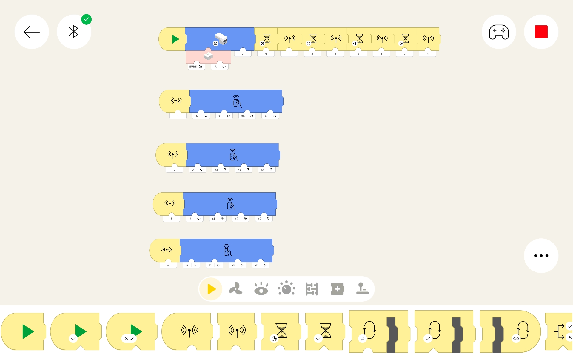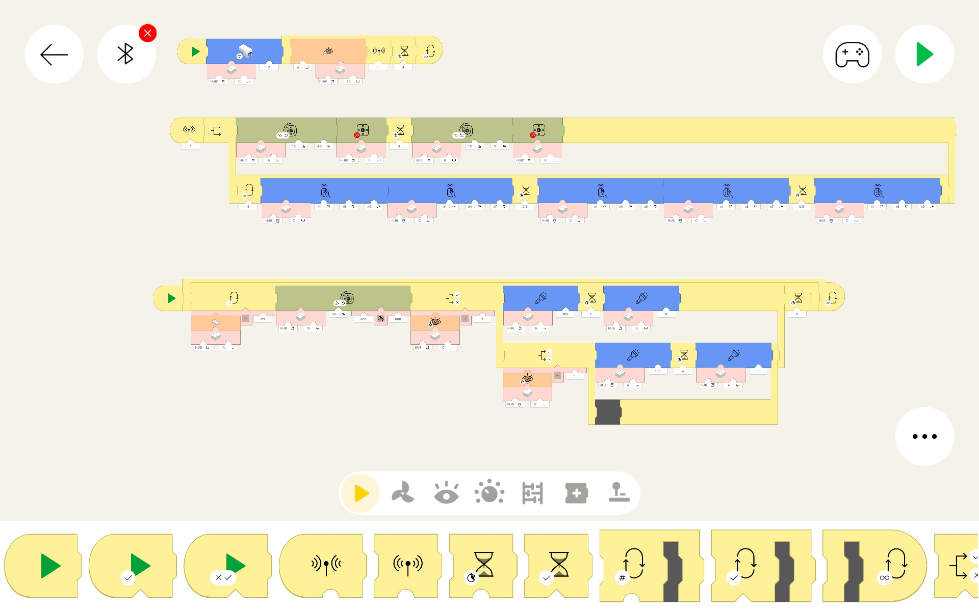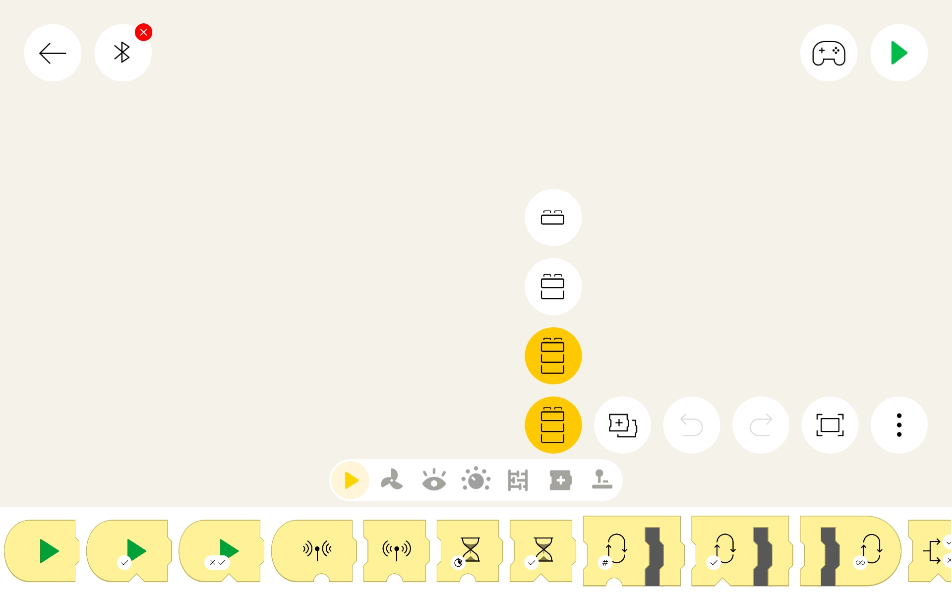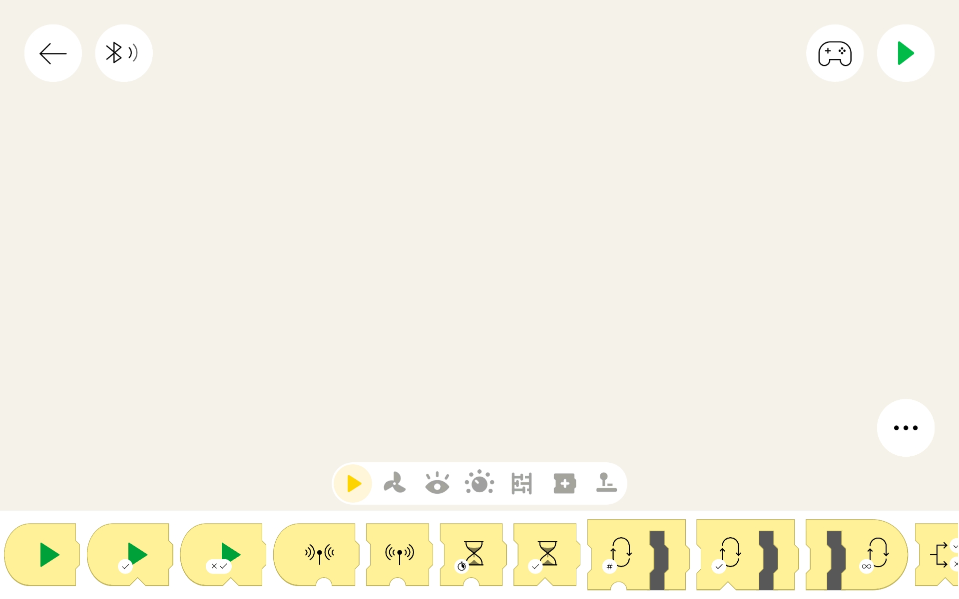 The layout is pretty simple. In the top left corner is a left arrow, which sends you back to the project list screen. Next to that is the Bluetooth symbol, which lets us manage which Lego hub(s) are used (more on that later). At top right is a controller icon, which lets you create remote control widgets. Next to that is a large green arrow, which is the button that starts all of the code segments to run. Near the lower right corner is a "..." symbol, which has settings which will be covered below.