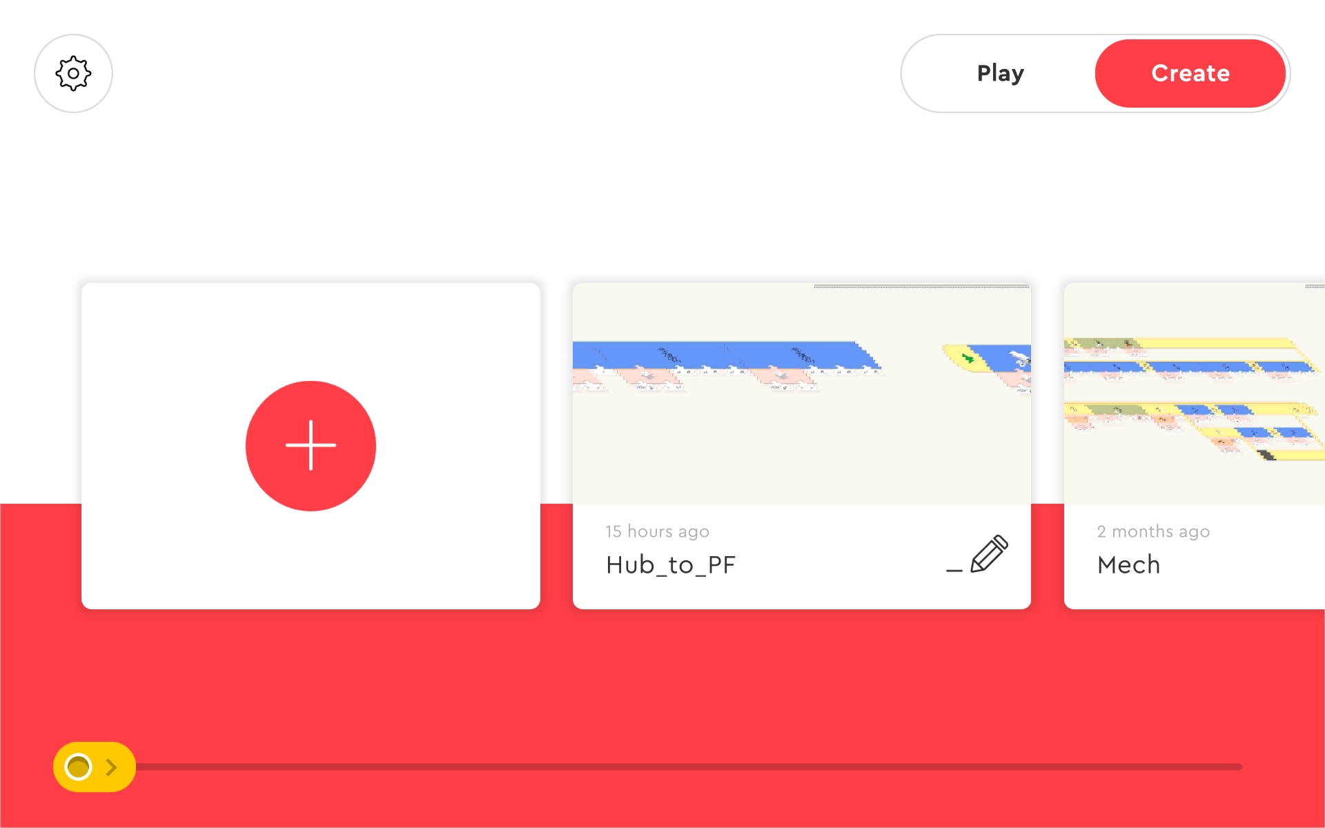At the top far left are two buttons: "PLAY" and "CREATE". Pressing the create button takes us to the custom coding section which this document is geared toward.