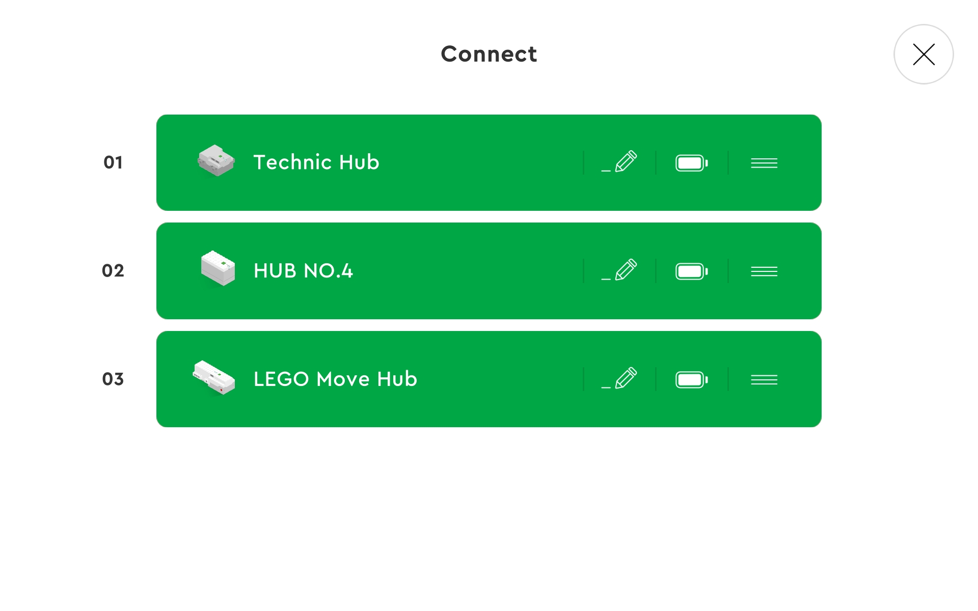 Each device listed has a number, image, name, pencil, battery, and grab bar (three horizonal lines). The number is used in the code to identify a specific device. Use the pencil button to change the displayed name of a device. The amount of remaining battery power is shown, which is very useful. Pressing the grab bar allows us to move that device up/down in the list. Be advised that this changes its number, so code blocks may also need to be updated!