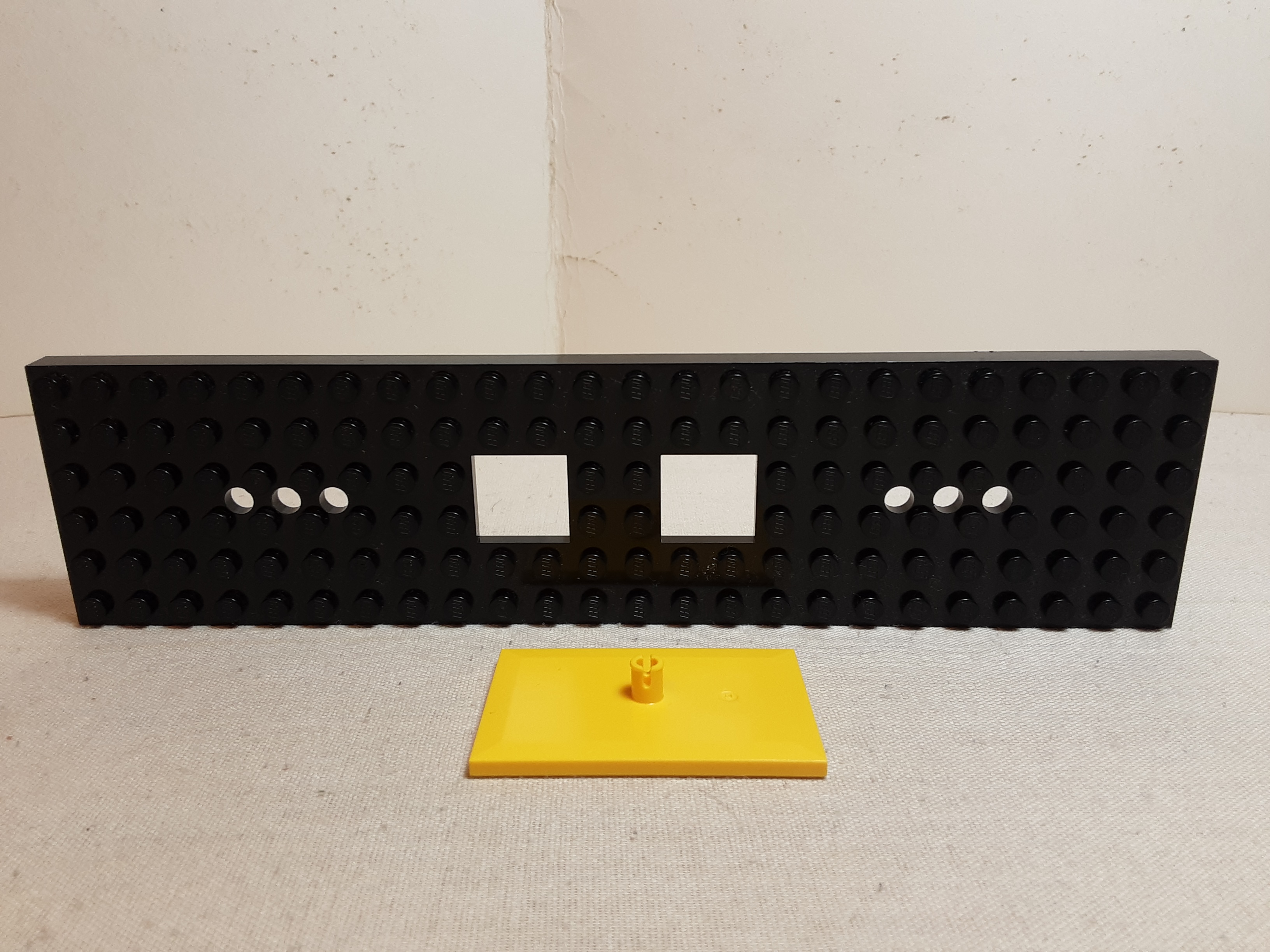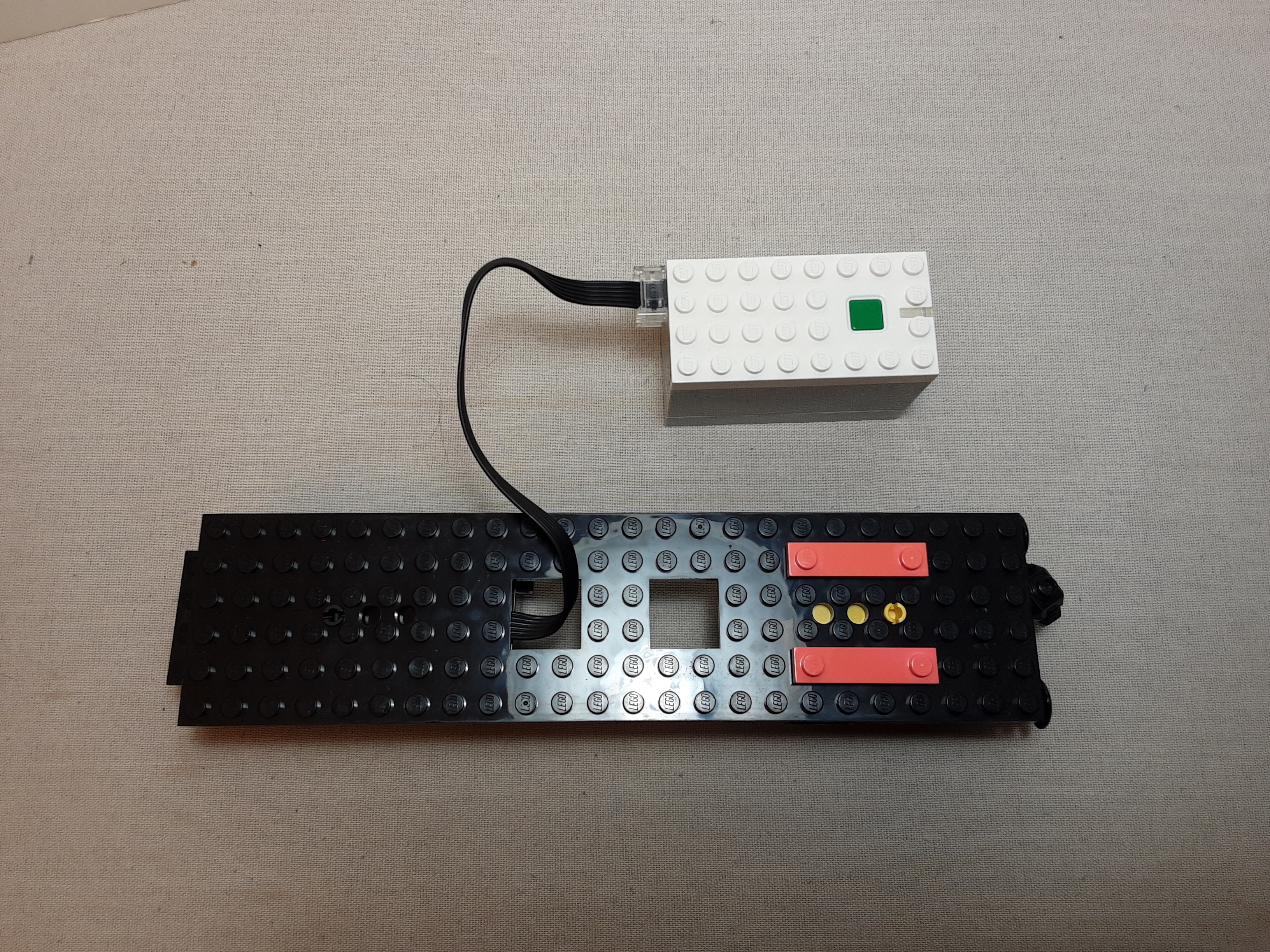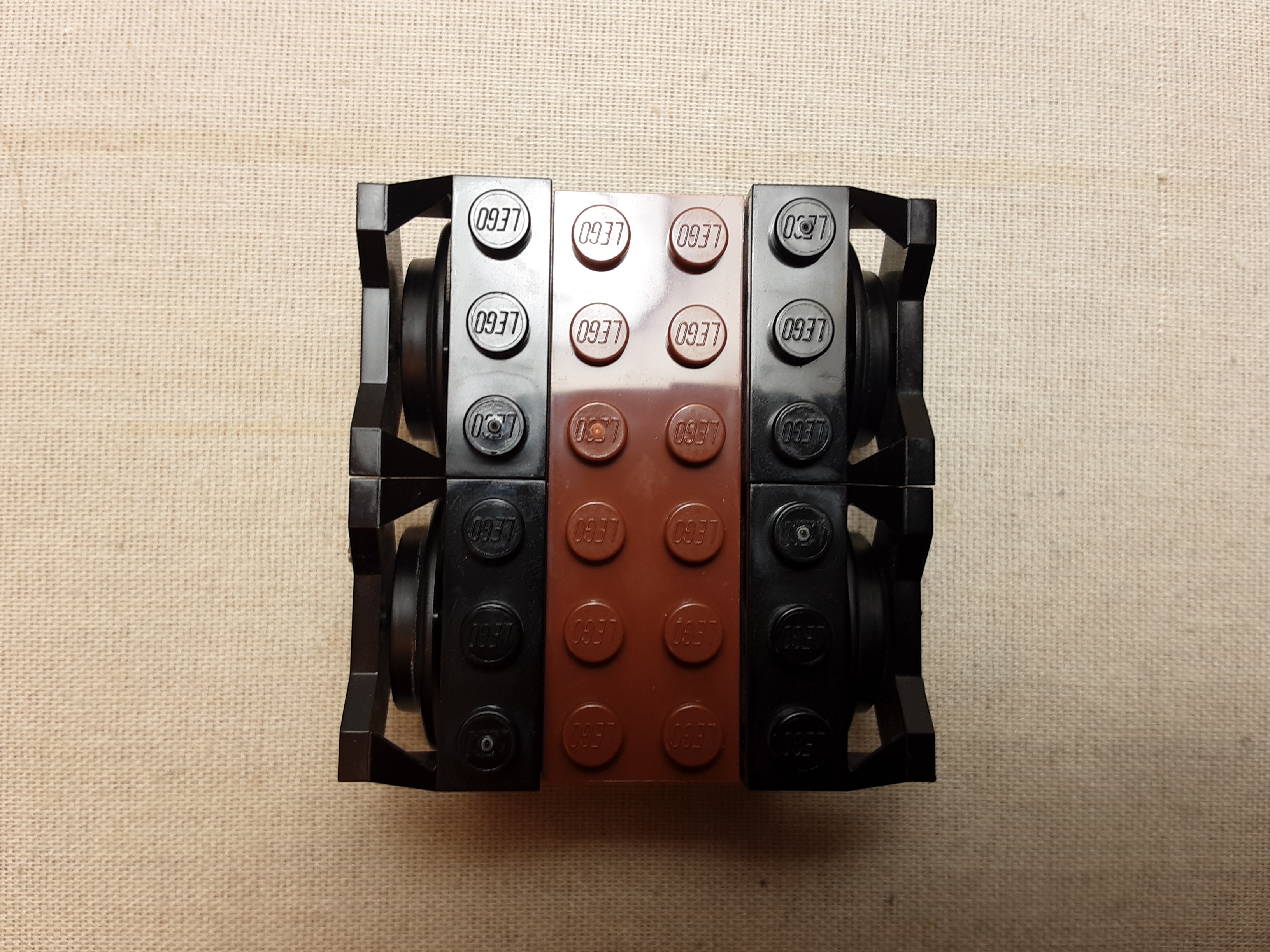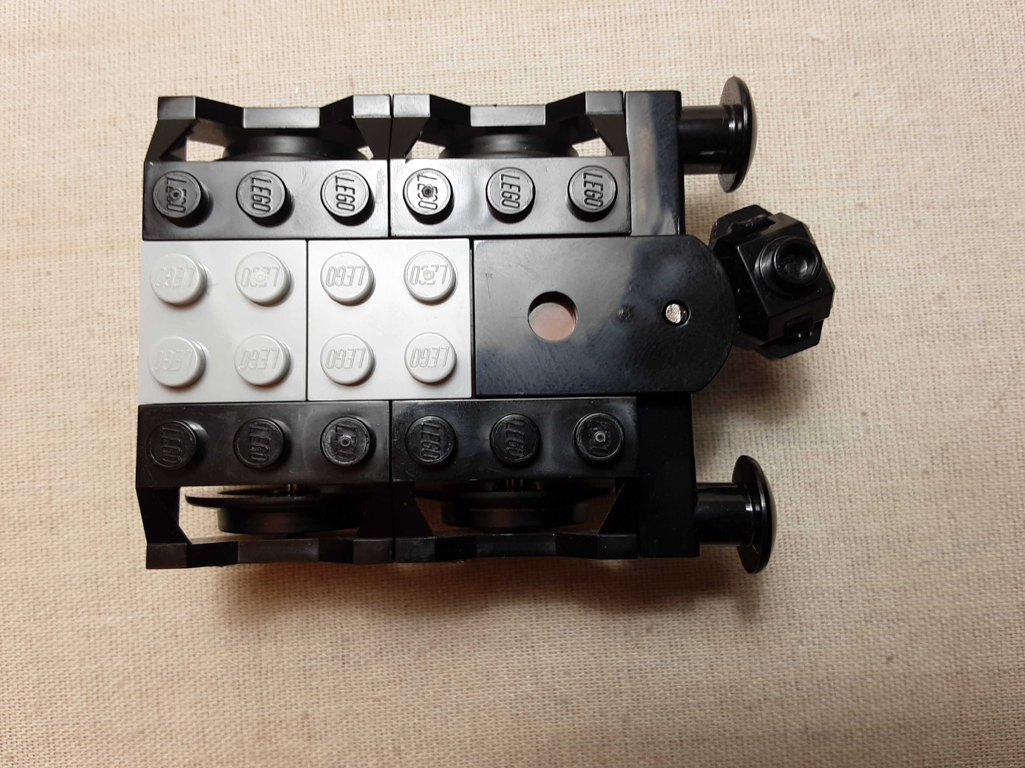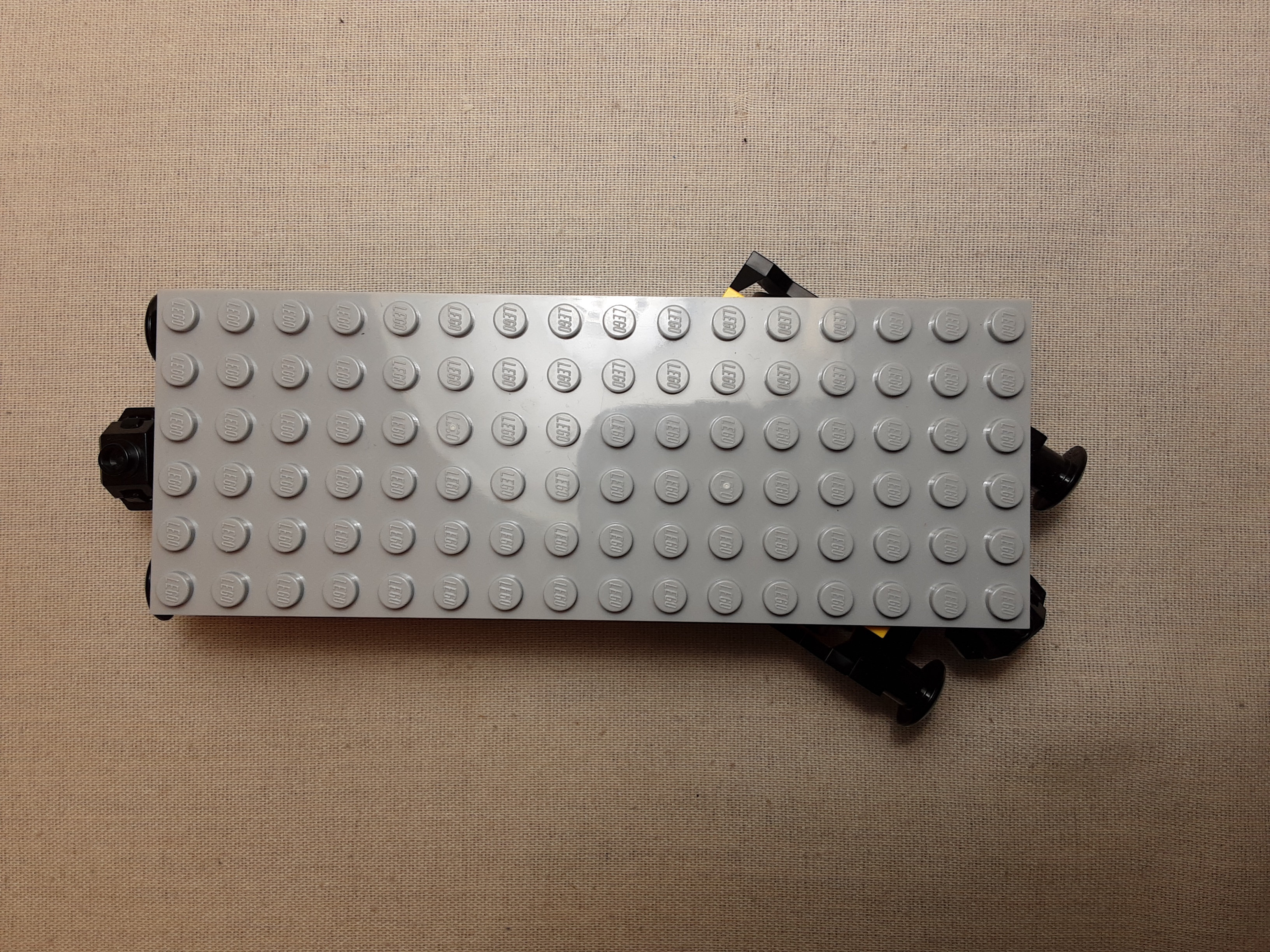 At one end of the 2x6 plate, we mount the Magnetic coupler (ID #6172149, Design #29084 or #29085). Note that the top of the coupler is flat (has no studs) and is now even with the top of the wheel housing. Next fill in the rest of the 2x6 plate with either a 2x4 plate or 2 2x2 plates.