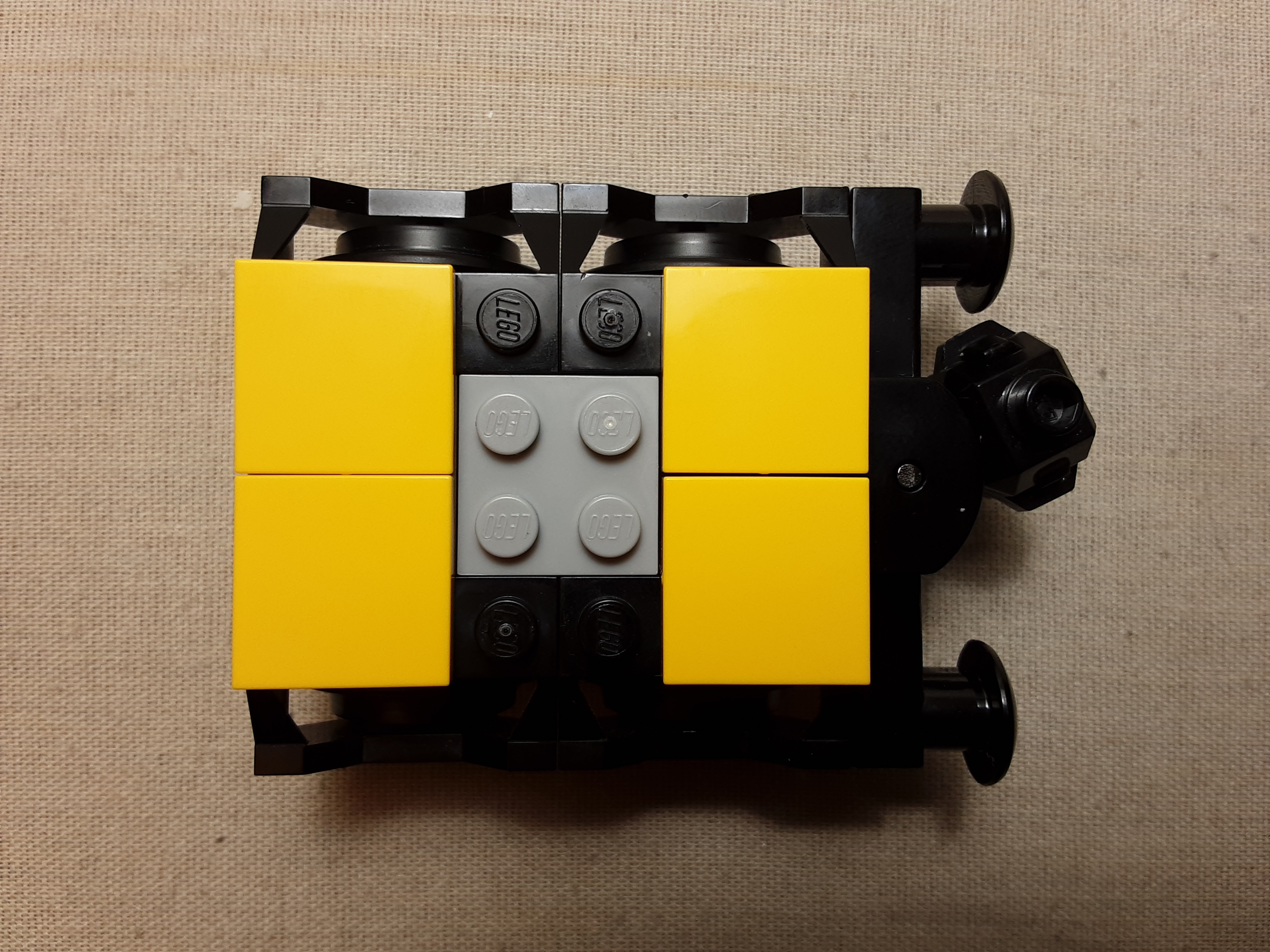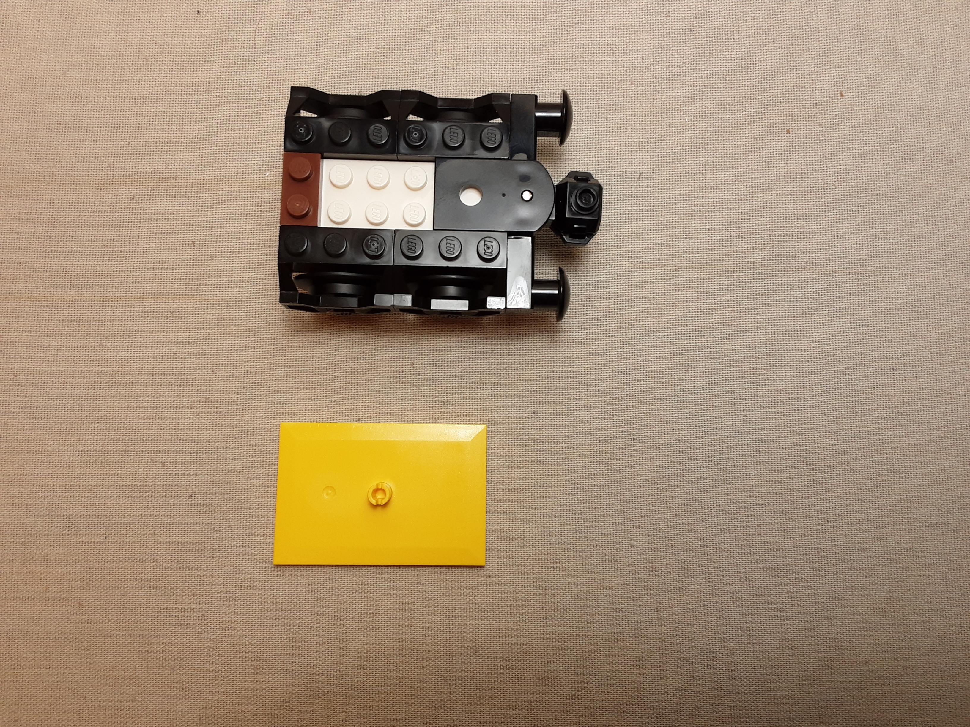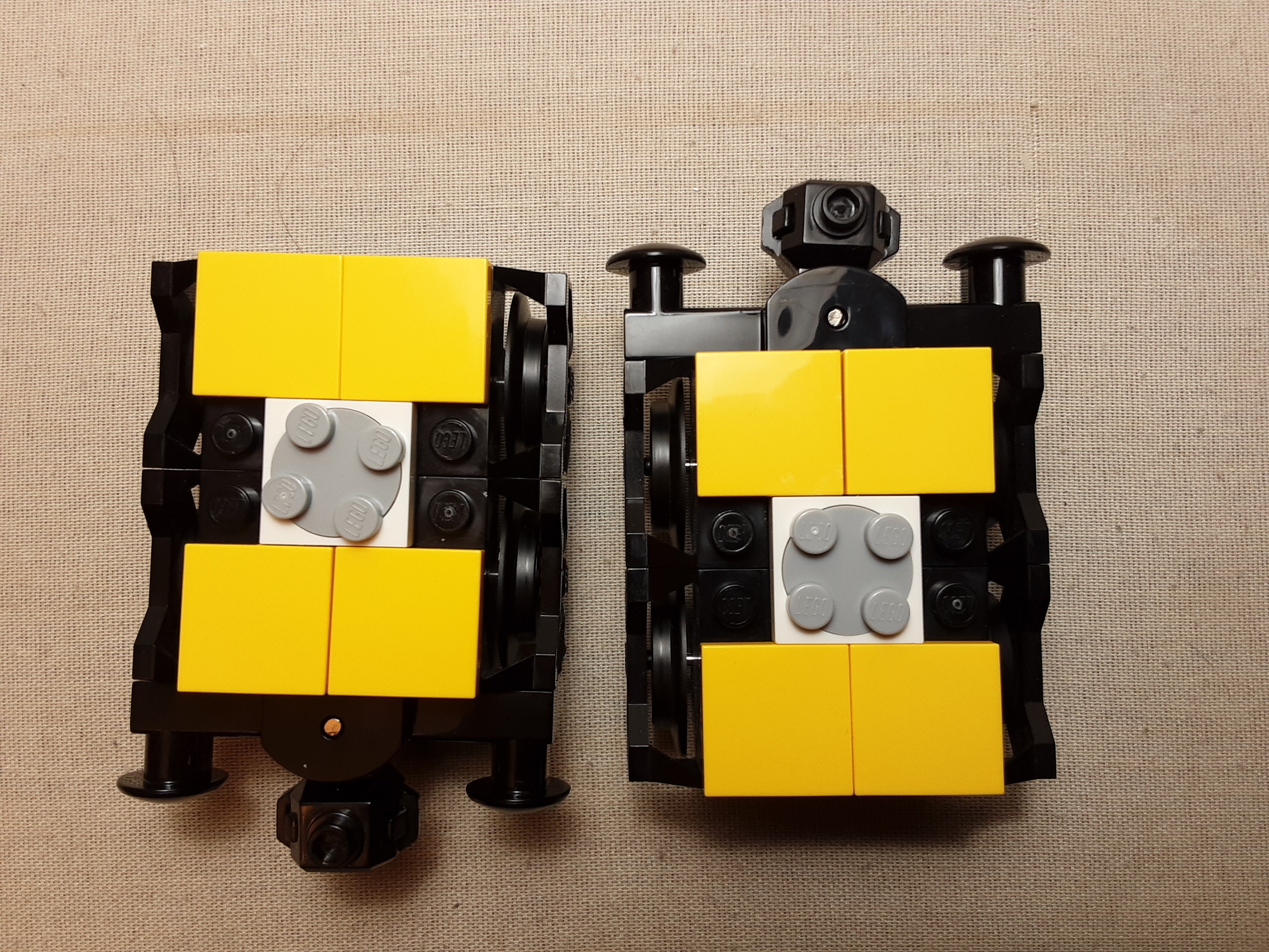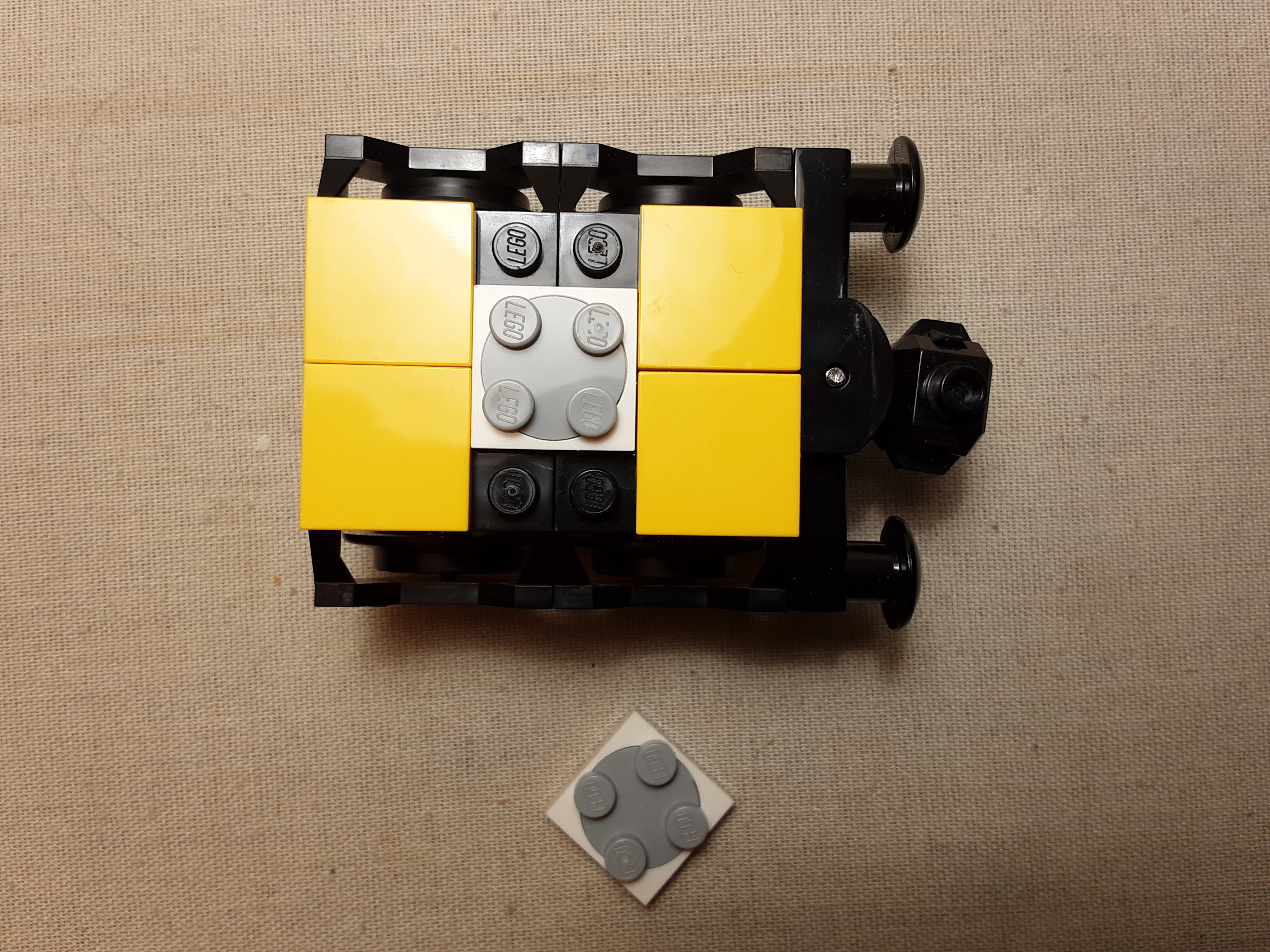Finally, we place a Turntable (bottom Design #3680, top Design #3679) in the center. This is what allows the wheel assembly to swivel when the track bends. I use a 2x2 Turntable, but a 4x4 turntable could be used instead (changing the other tiles to 1x2 or 1x4).