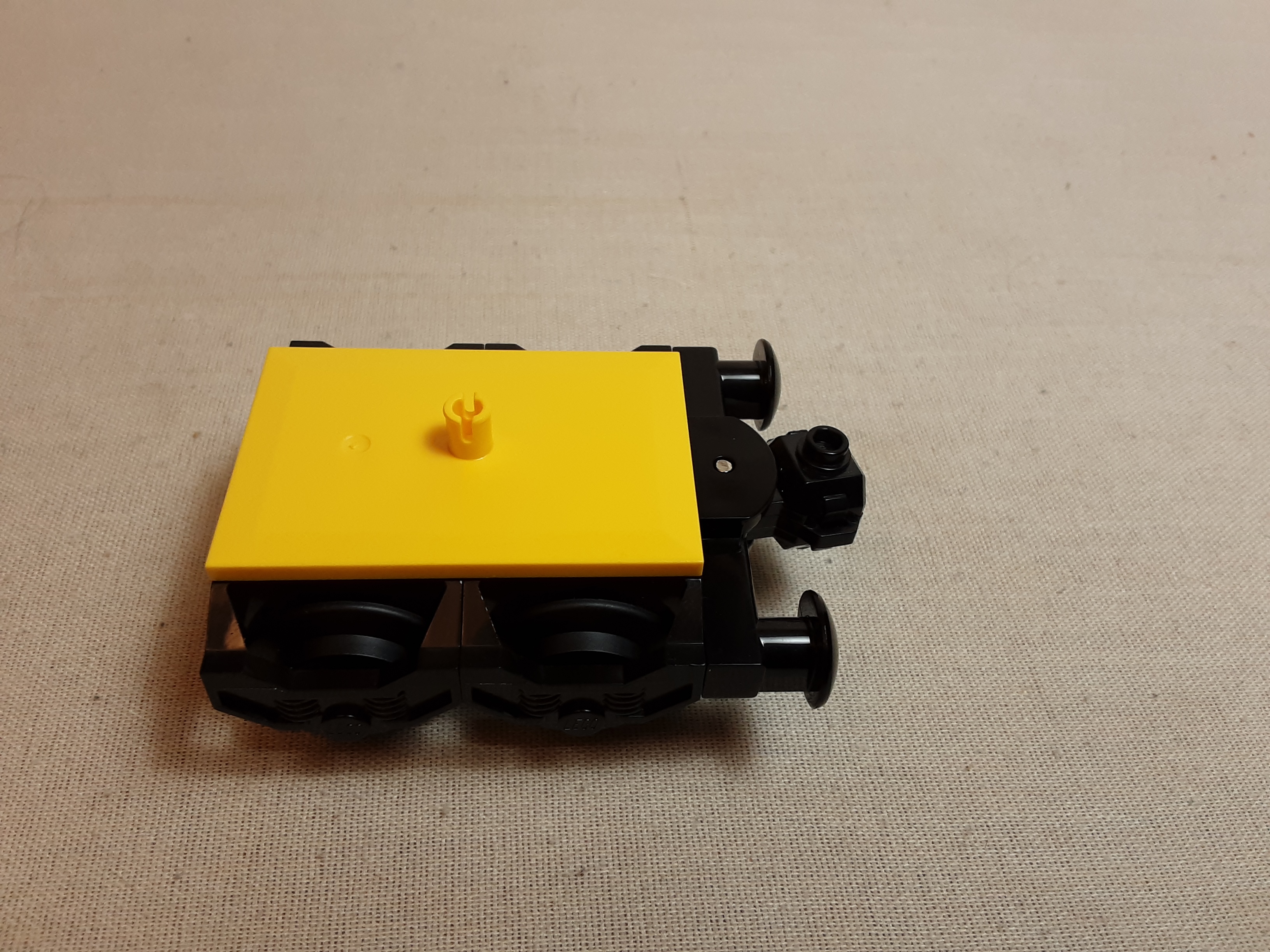 Since the bed plate will sit directly above the wheel assembly, we need to use tiles (no studs on top) to allow the wheel assemblies to move without bumping against the bed plate. A 2x4 tile make a more sturdy base, even though my example photo shows 2 2x2 tiles. The tiles above the coupler keep it in place.