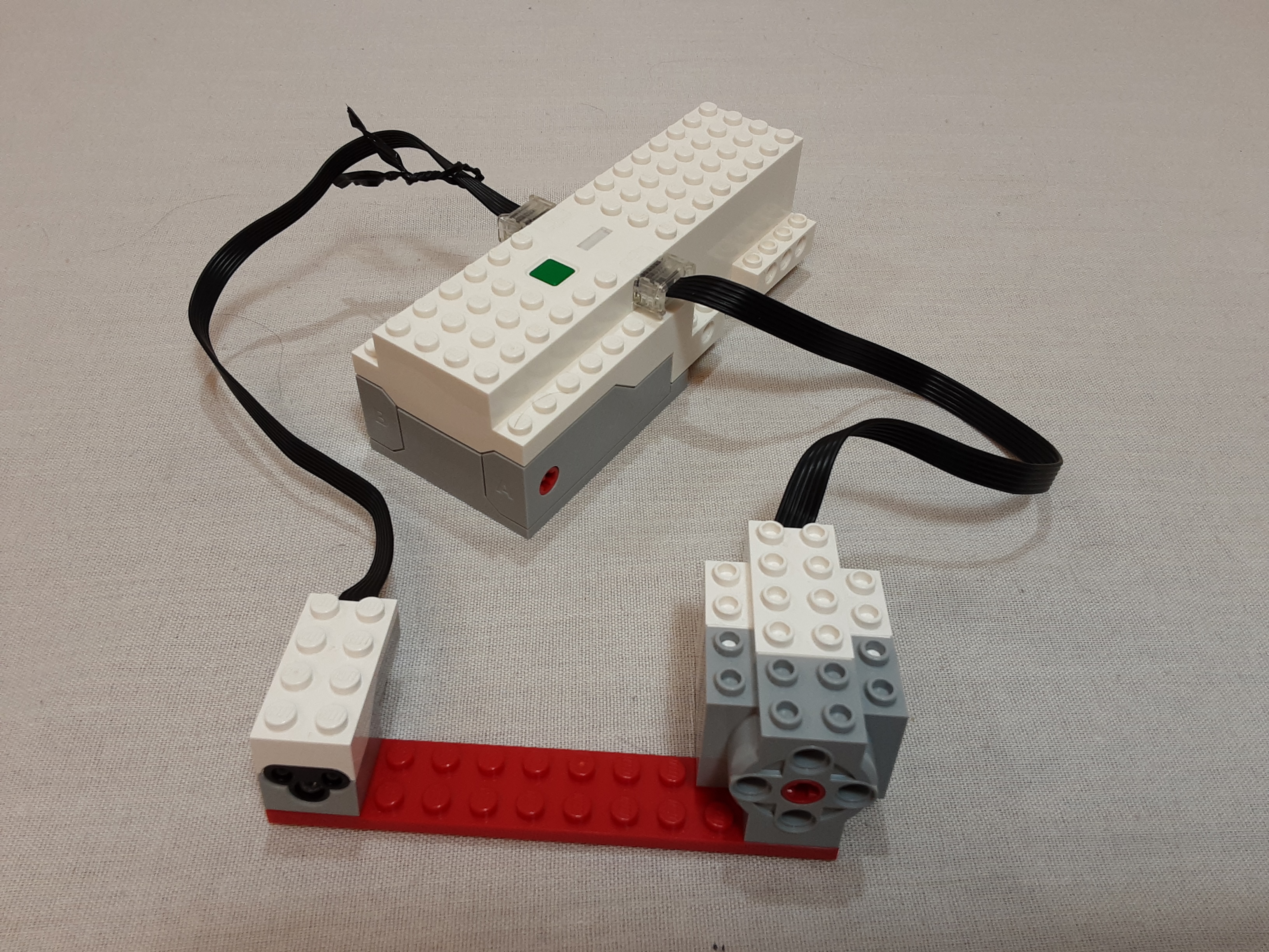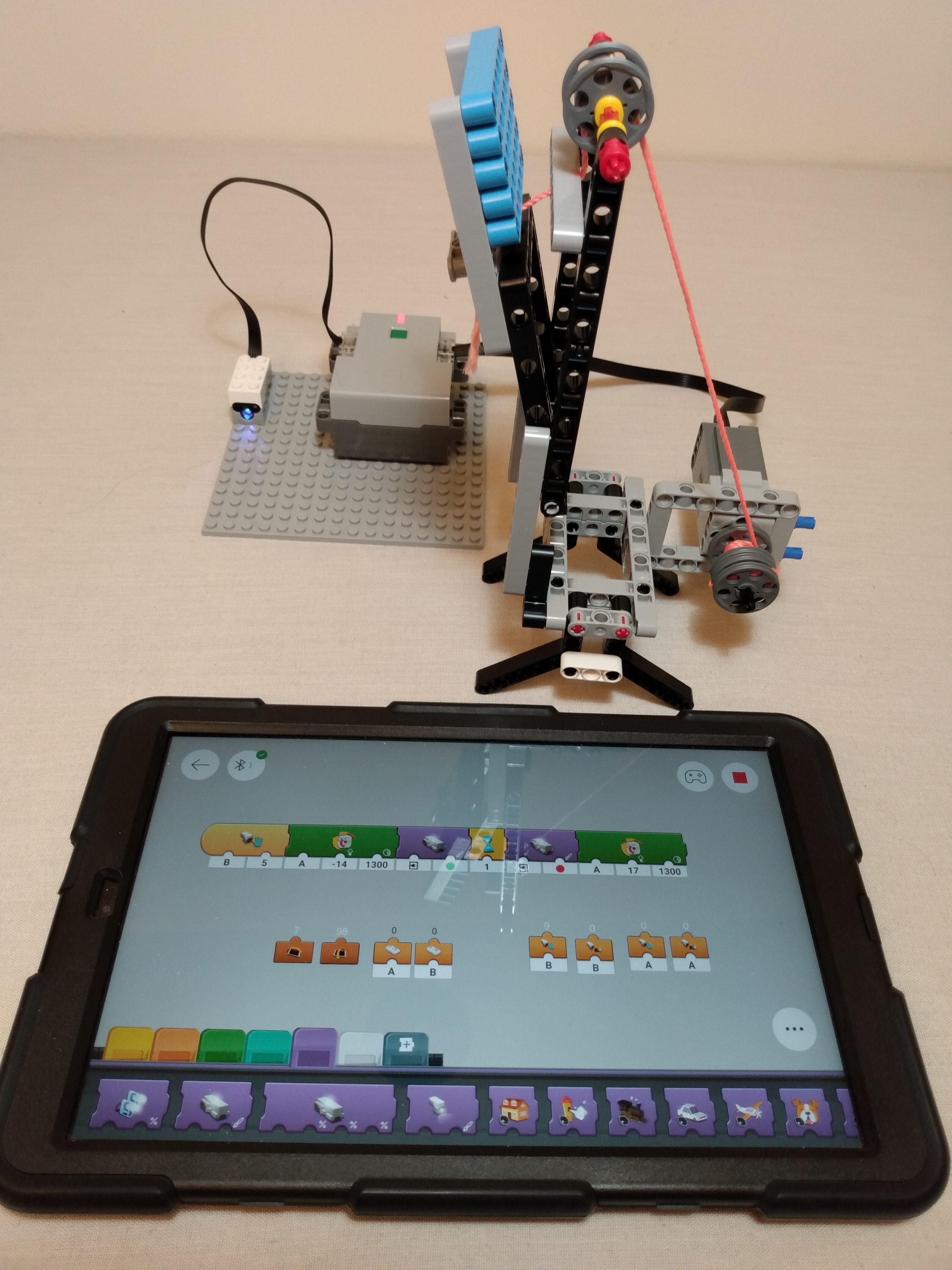 In the video above, a simple drawbridge is controlled by the Powered Up system. A string is connected to the bridge and runs though a pulley on the way to the motor drum. The drawbridge starts in the raised position so that nobody can enter the castle. When motion is detected at the bridge landing area, the program runs. First the motor is turned counter-clockwise enough distance to (almost) reach the ground. Notice how the light on the hub turns green (usage allowed) at this point. After 2 seconds, the hub light turns red (not allowed to use bridge) and the motor turns clockwise to raise the drawbridge back to its original position. Note that the bridge needs to have enough weight for gravity to pull it down when string becomes loose. It would be possible (probably even more practical) to have the motor directly control the drawbridge movement, but this shows how a system could mimic cables being used in real life situations. The speed, precise positioning, and timing can all be easily adjusted with the app program.