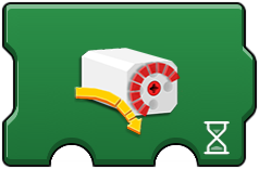 More control over a tacho motor is allowed with these icons. First option is the motor port. 'Stop' (red square and ! in icon) stops and holds the motor, which implies a brake is used. The second option with a 'meter' sets the maximum power (speed) allowed (0-100) and stays in effect until changed again. The second option with an 'hourglass' is the time in seconds (with fractions allowed) for the action. The icon with the upward curved arrow is for 'acceleration' time while the icon with the downward curved arrow is for 'deceleration' time. These set the time desired before the motor gets to its full speed, often helpful to allow for smoother starts and stops. |