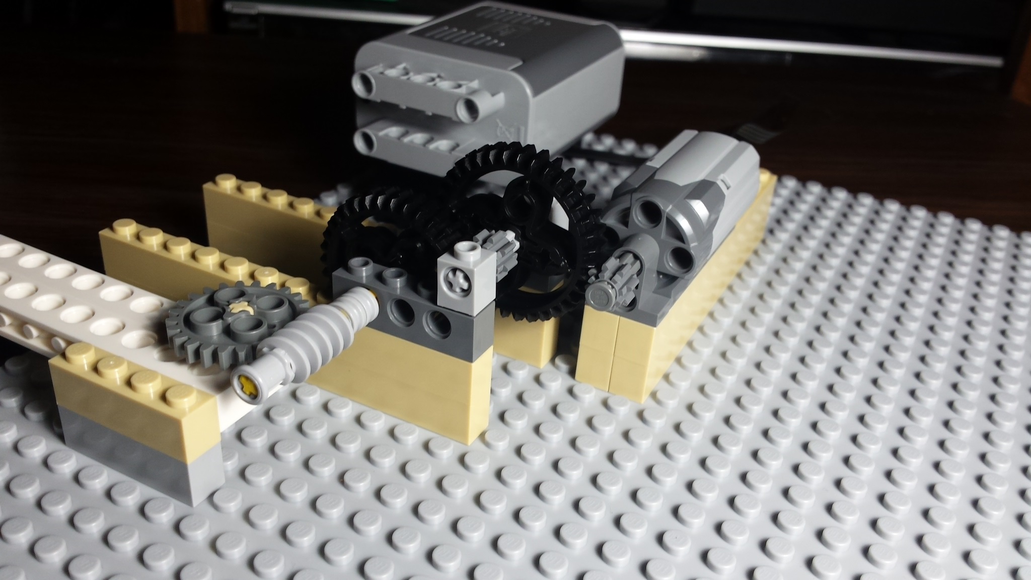 Attaching an 8 teeth gear to the motor shaft and having that turn a 36 teeth gear on an axle makes that axle turn at the 4.5 reduced rate of 11.11rps (50rps ÷ 4.5). Attaching an 8 teeth gear to that axle and having it turn a 36 teeth gear on another axle makes that axle turn at another 4.5 reduced rate (now a 20.25 gear reduction from the motor, 4.5 × 4.5) of 2.47rps (50rps ÷ 20.25). Attaching an 8 teeth gear to that axle and having it turn a 36 teeth gear on yet another axle makes that axle turn at another 4.5 reduced rate (now a 91.125 gear reduction from the motor, 4.5 × 4.5 × 4.5) of .55rps (50rps ÷ 91.125). That is pretty close to our target of .5rps so lets find out how we did.