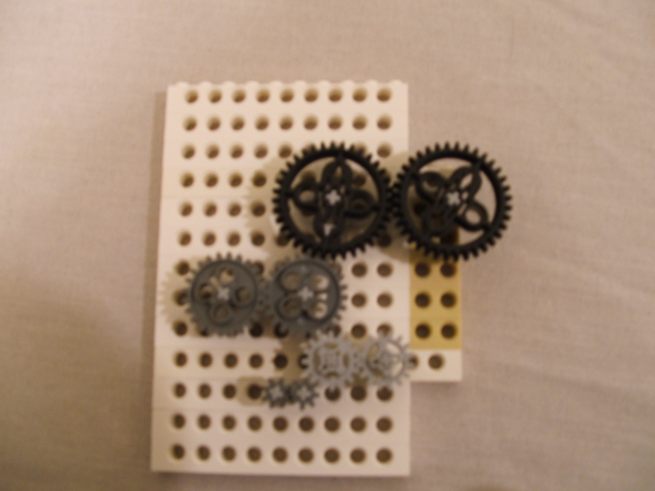 Above we have gears of teeth counts (top to bottom): 36, 24, 16, and 8. They are ALL mounted on an axle in their center. So lets figure out the meshing to confirm the above picture. We will start with the pair of 8 teeth gears at the bottom and work upward.